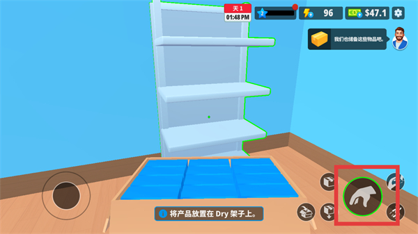 4、找到貨架區(qū)域,點(diǎn)擊交互按鈕將采購的商品放置到Dry架子上。