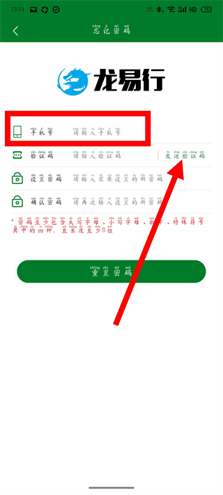 4、在找回密碼頁面,輸入手機(jī)號,點擊發(fā)送驗證碼。