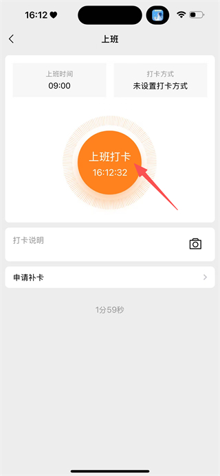 3、在頁面,點擊中間顯示時間的上班打卡,完成當日的上班打卡操作。