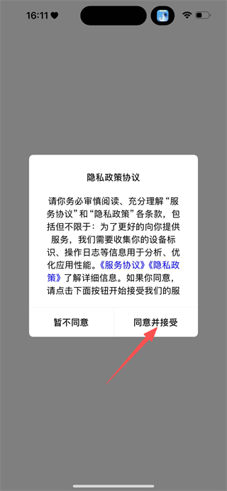 1、在該考勤的隱私政策協(xié)議彈窗中,點擊同意并接受,進入考勤首頁。