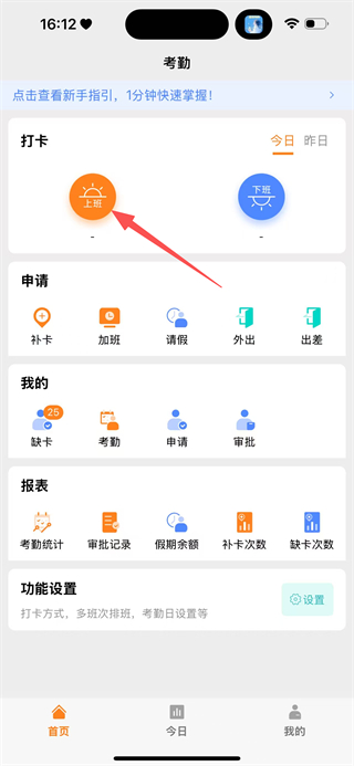 2、在考勤首頁的打卡區(qū)域,點擊上班按鈕,進入上班打卡的操作頁面。