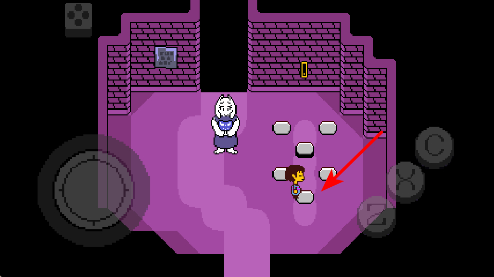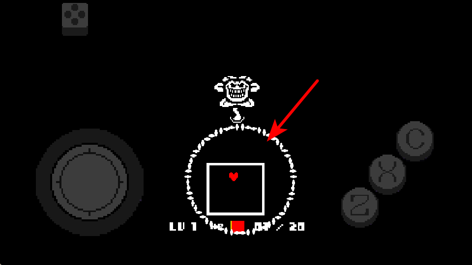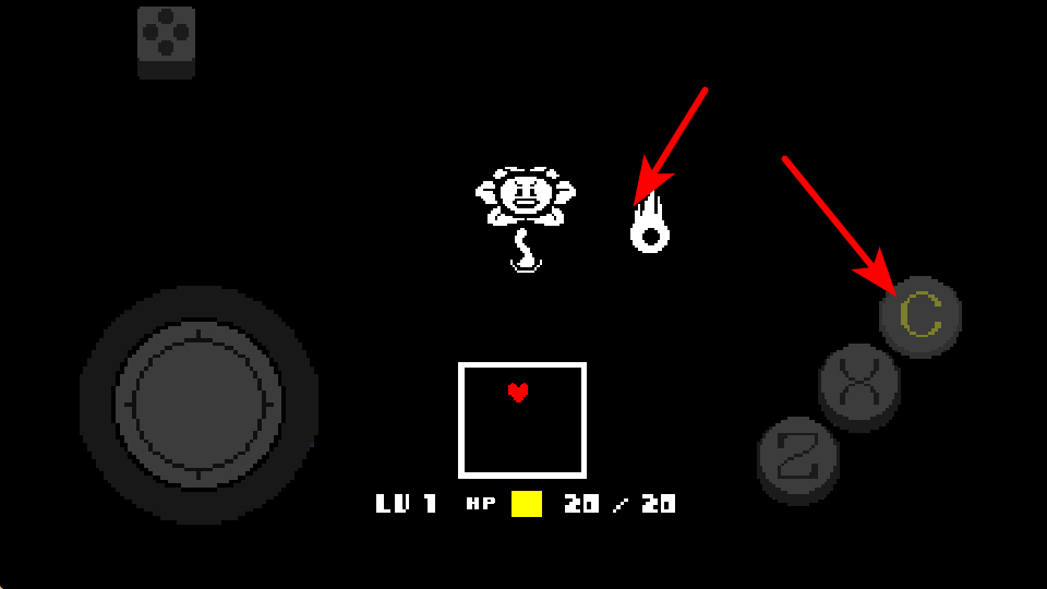 2、當(dāng)敵方釋放攻擊時(shí),點(diǎn)擊紅色箭頭指向的C按鍵,可觸發(fā)對應(yīng)操作,同時(shí)操控愛心區(qū)域躲避襲來的攻擊。
