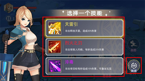 2、戰(zhàn)斗中擊敗敵人后會出現(xiàn)技能選擇界面,可從三個技能里選其一,也能點擊刷新更換技能。
