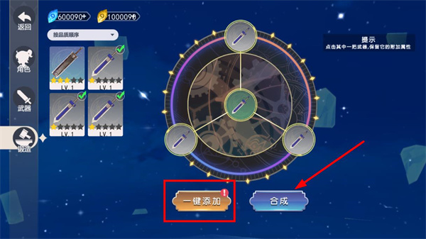 3、進(jìn)入鍛造界面,點擊一鍵添加放入多余武器,點擊合成,可隨機獲得新武器。