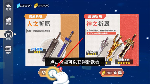 1、進(jìn)入祈福界面,選擇普通或高級祈福獲取武器,獲得普通或精良武器,高級祈福消耗資源有概率得稀有裝備。