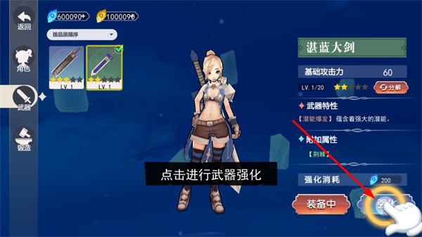 4、進(jìn)入武器界面,選擇武器,點擊強化按鈕消耗資源,提升當(dāng)前武器的基礎(chǔ)攻擊力。