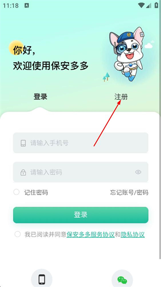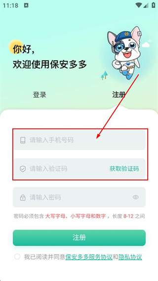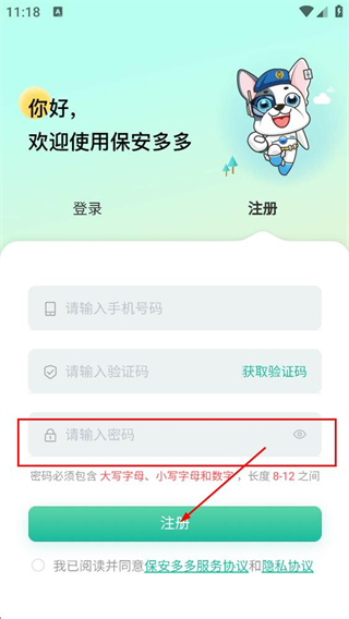 4、在注冊(cè)界面,填寫符合要求的密碼,點(diǎn)擊注冊(cè)按鈕,完成保安全多的賬號(hào)注冊(cè)。