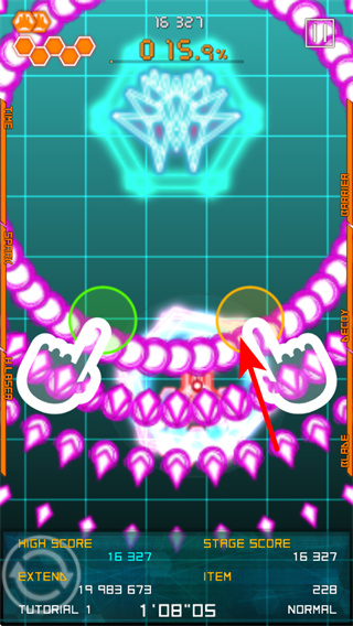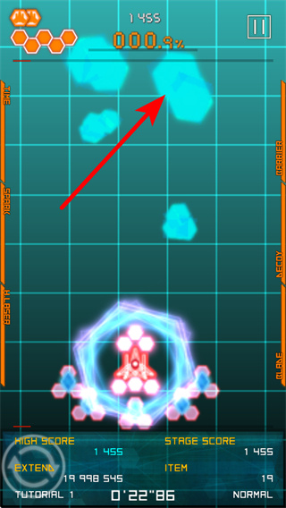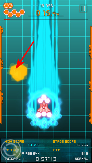 4、遇到密集彈幕時(shí),拖動(dòng)紅色箭頭指向的區(qū)域,操控戰(zhàn)機(jī)移動(dòng)到安全區(qū)域,避開彈幕攻擊。