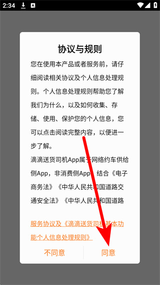 1、打開滴滴送貨,進(jìn)入后會彈出彈窗,點擊彈窗下方的同意,進(jìn)入應(yīng)用主頁面。