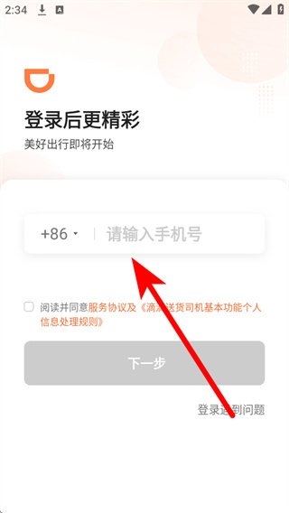 3、在登錄頁面的手機(jī)號輸入框中,填寫手機(jī)號碼,同時勾選相關(guān)協(xié)議,隨后點擊頁面中的下一步。