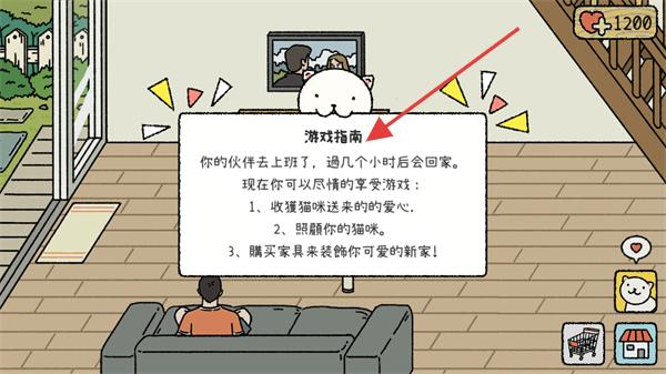 1、進(jìn)入游戲后查看游戲指南,了解伙伴上班期間可收集貓咪送來(lái)的愛(ài)心、照顧貓咪,還能購(gòu)買家具裝飾自己的家。