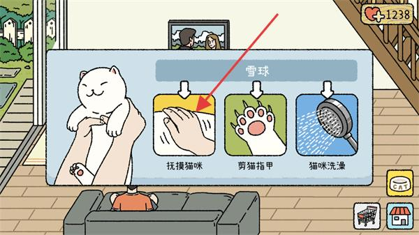3、點(diǎn)擊貓咪后出現(xiàn)雪球?qū)?yīng)的互動(dòng)界面,選擇其中的撫摸貓咪選項(xiàng),完成互動(dòng)以獲取對(duì)應(yīng)的愛(ài)心獎(jiǎng)勵(lì)。