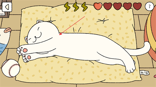 4、找到處于休息狀態(tài)的貓咪,點(diǎn)擊該貓咪對(duì)應(yīng)的區(qū)域進(jìn)行撫摸,觸發(fā)互動(dòng)操作,以此來(lái)獲取對(duì)應(yīng)的愛(ài)心或相關(guān)游戲資源。