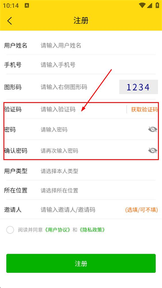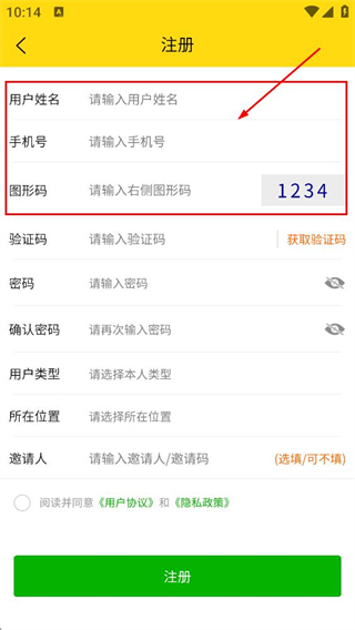 2、在注冊界面,填寫用戶姓名手機號對應的信息,以及右側圖形碼對應的內容。
