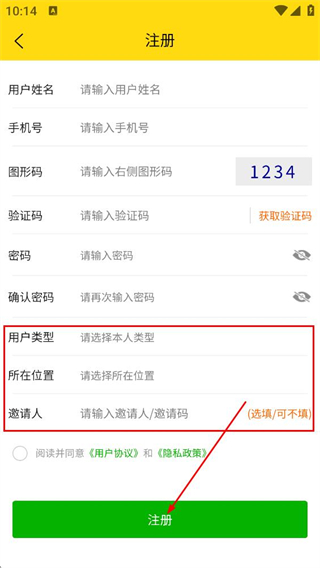 4、在注冊界面,選擇請選擇本人類型、請選擇所在位置,點擊注冊按鈕完成賬號注冊。
