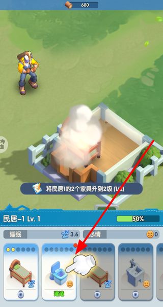 3、在民居界面建造床和馬桶等家具,提升角色的睡眠和心情屬性,推進(jìn)民居的升級(jí)進(jìn)度。