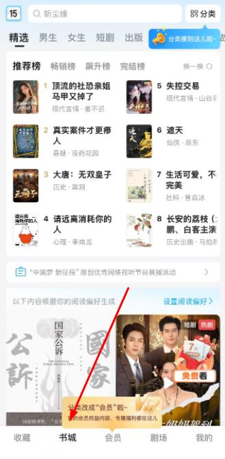 1、在書城頁面中點擊底部導(dǎo)航欄的會員按鈕,進(jìn)入會員專屬板塊,可查看會員專享福利及內(nèi)容。