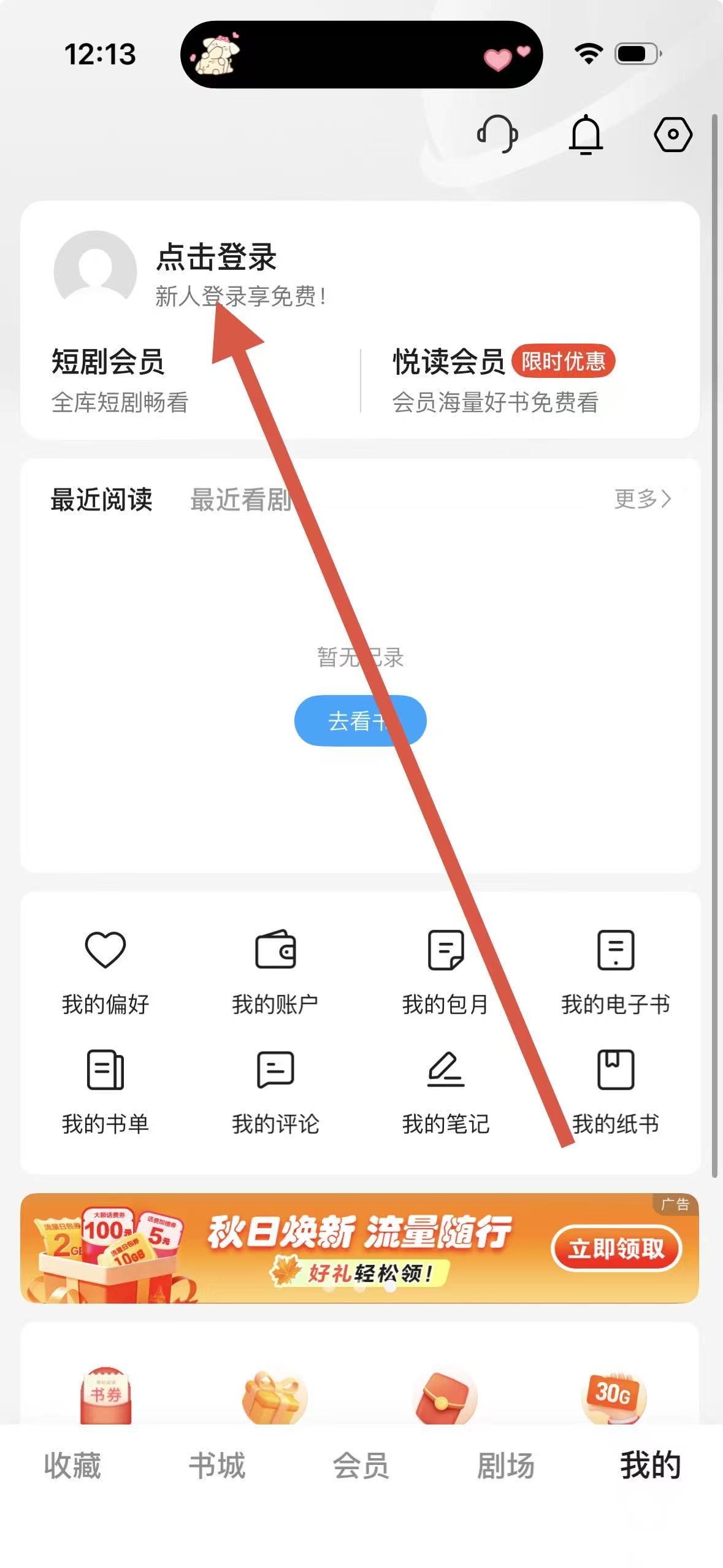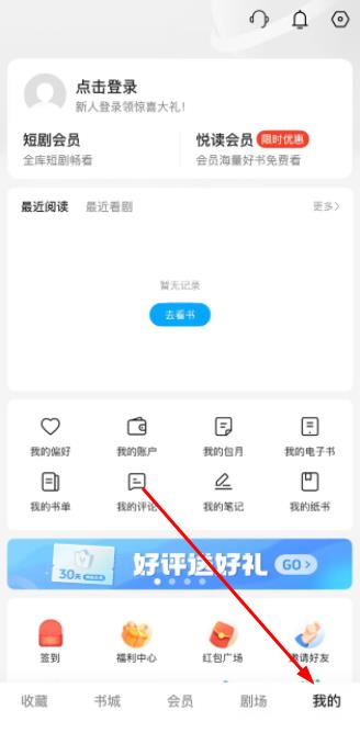 2、點擊底部導(dǎo)航欄最右側(cè)的我的選項,進(jìn)入個人中心頁面,可進(jìn)行賬號登錄、查看閱讀記錄等操作。