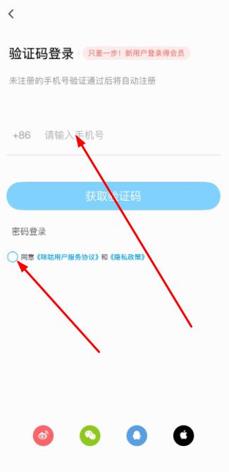 3、進(jìn)入驗證碼登錄界面后,先勾選同意網(wǎng)站用戶服務(wù)協(xié)議和隱私政策,再在手機號輸入框填寫號碼,點擊獲取驗證碼完成登錄步驟。