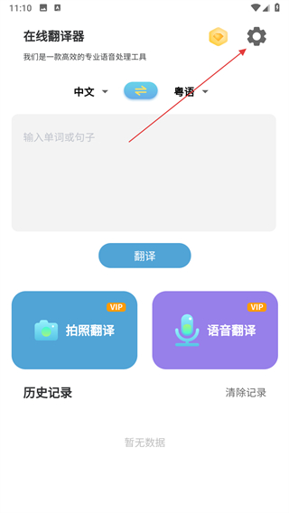 1、打開在線翻譯小助手應(yīng)用,在主界面找到設(shè)置圖標(biāo)并點(diǎn)擊。