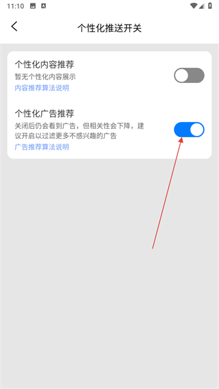 3、找到個(gè)性化廣告推薦對(duì)應(yīng)的開關(guān),點(diǎn)擊關(guān)閉該開關(guān)即可。