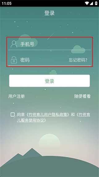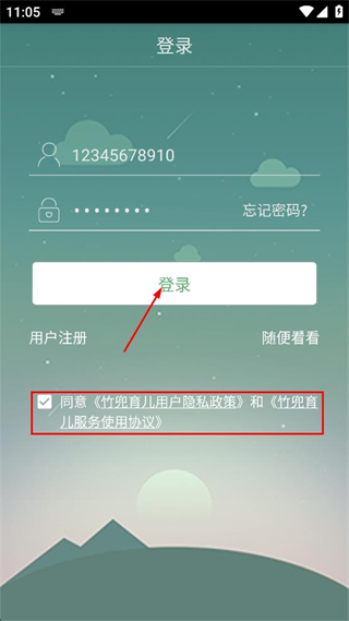 4、勾選同意相關(guān)協(xié)議的選項(xiàng),點(diǎn)擊登錄按鈕,完成竹兜育兒軟件的賬號(hào)登錄操作。