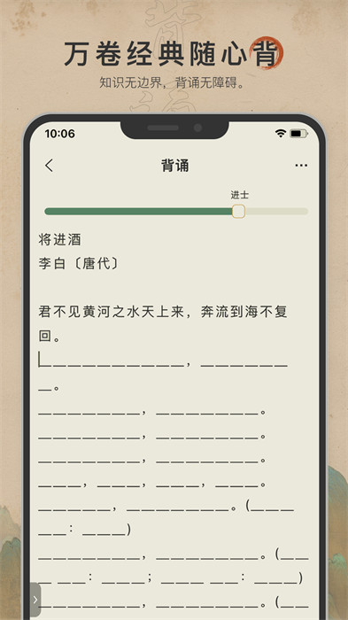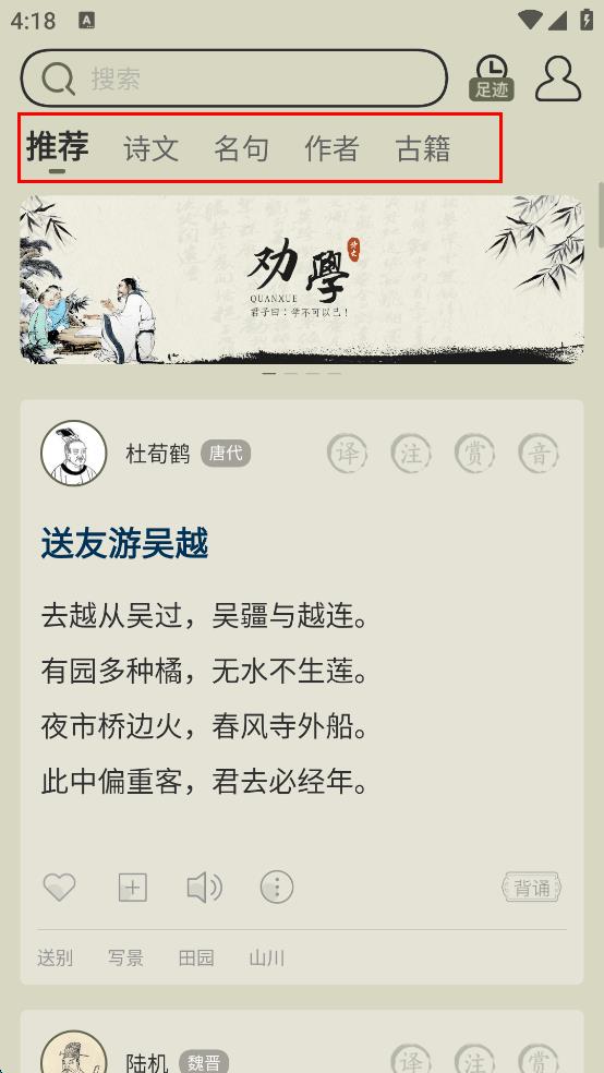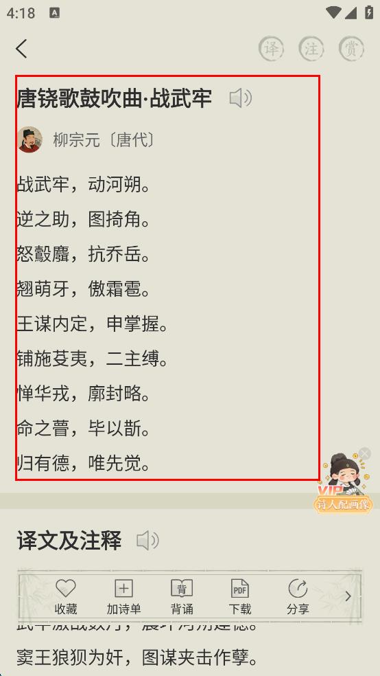 4、點(diǎn)擊詩文后,進(jìn)入詩文詳情界面,可查看詩文的完整內(nèi)容,還有“譯文及注釋”板塊,以及“收藏”“加詩單”“背誦”等功能選項,盡情了解詩文信息。