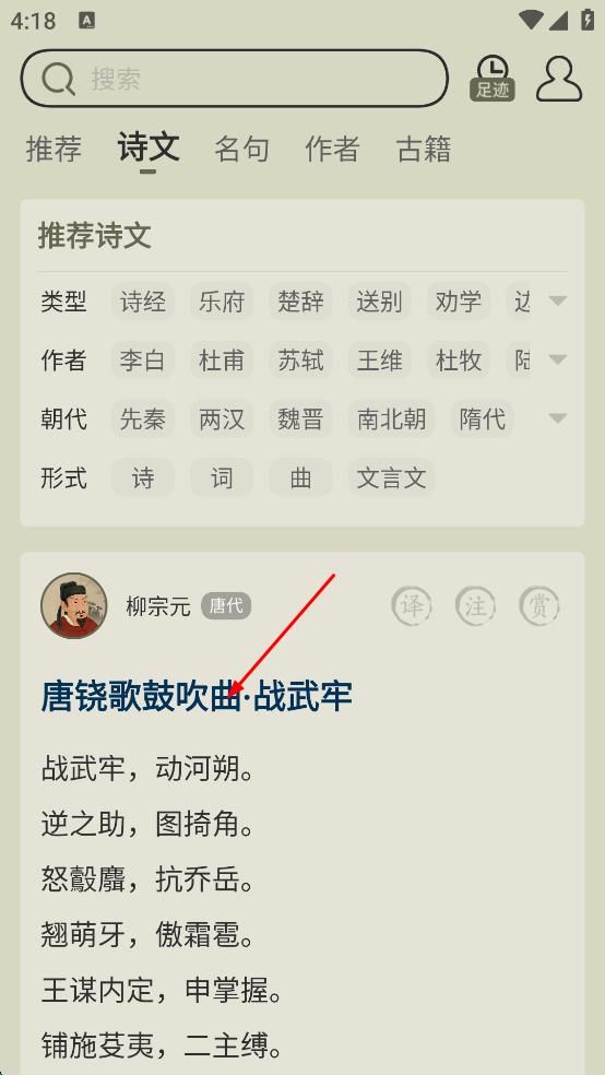 3、進(jìn)入詩文界面,界面有“推薦詩文”板塊,可按類型、作者、朝代、形式篩選,找到想要查看詳情的詩文,比如唐鐃歌鼓吹曲·戰(zhàn)武牢,點(diǎn)擊該詩文。