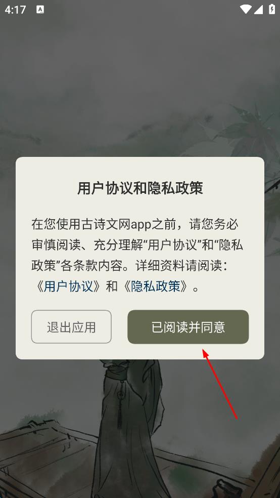 1、打開古詩文網(wǎng),進(jìn)入用戶協(xié)議和隱私政策界面,界面說明使用前需審慎閱讀、充分理解“用戶協(xié)議”和“隱私政策”各條款內(nèi)容,點(diǎn)擊“已閱讀并同意”按鈕。