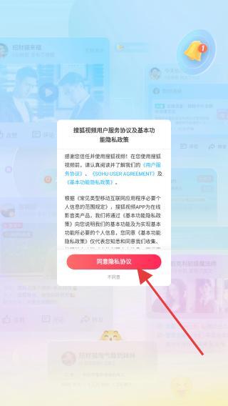 1、打開搜狐視頻APP,進(jìn)入時(shí)會(huì)彈出用戶服務(wù)協(xié)議以及隱私政策,點(diǎn)擊同意隱私協(xié)議的按鈕。