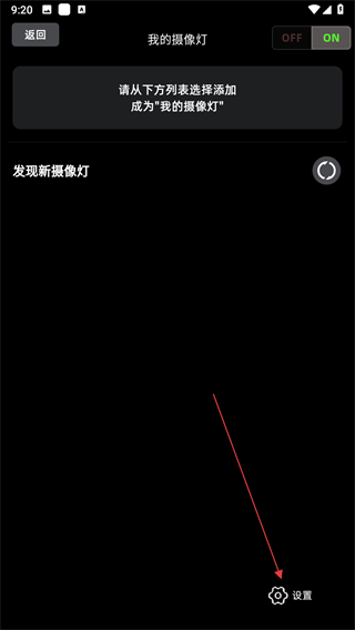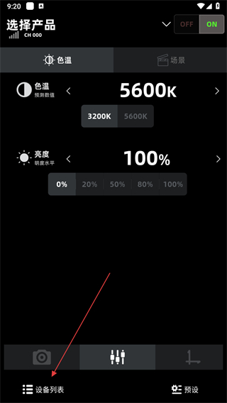 1、打開永諾攝像燈控制應用,點擊設備列表選項。