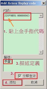 菜單欄里選“模擬”-“修改”-“列表” 出現(xiàn)一個窗口,點下面“Action Replay”,又出現(xiàn)一個小窗口,上面大框?qū)懭氪a,下面小框?qū)懭朊枋觯ㄒ部梢圆粚懀?,點最下面“添加”即可 然后返回金手指窗口,金手指碼就會出現(xiàn)在這里,前面有個“X”表示金手指開啟,點擊就可以關(guān)閉 添加好金手指后,點下面“保存”即可!(見下圖)