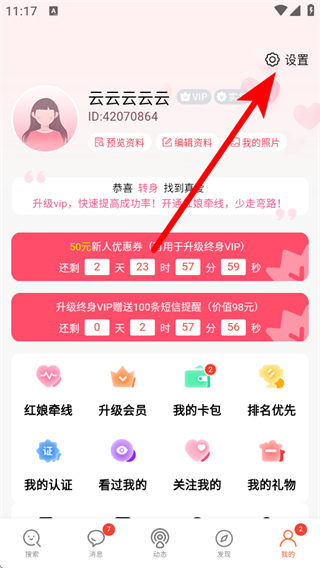 1、打開一線姻緣應用,點擊我的頁面右上角的設置圖標。