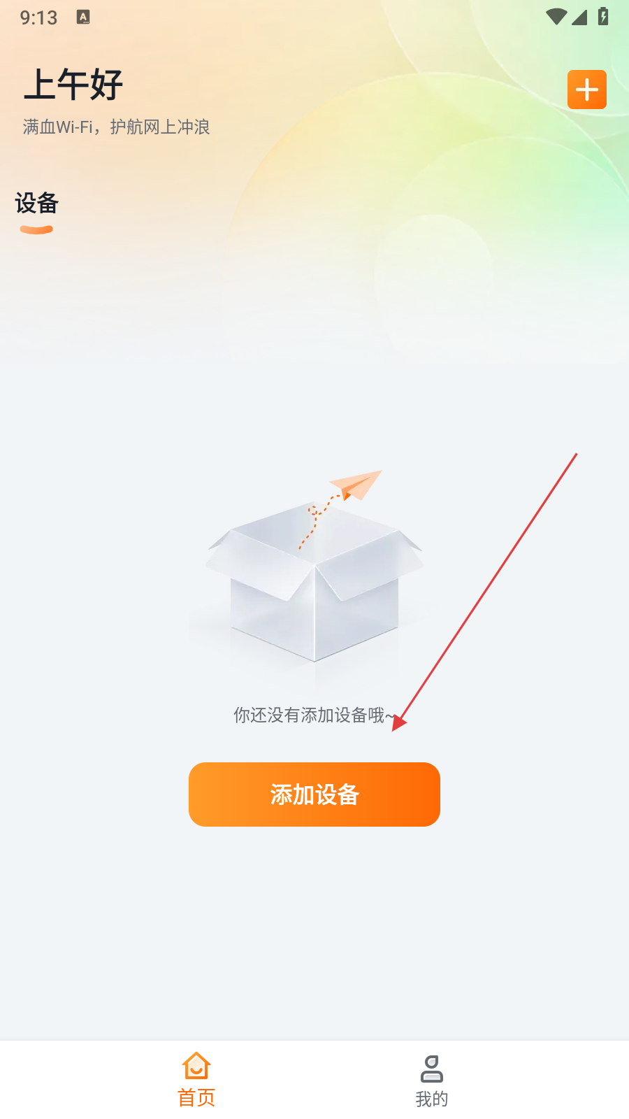 1、打開騰達(dá)WiFi應(yīng)用,點(diǎn)擊首頁(yè)中間橙色添加設(shè)備按鈕,進(jìn)入選擇設(shè)備類型的頁(yè)面。