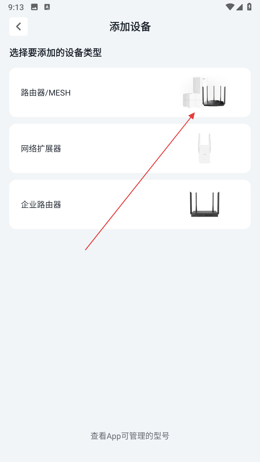 2、在設(shè)備類型頁(yè)面,點(diǎn)擊路由器/MESH選項(xiàng),進(jìn)入連接設(shè)備WiFi的引導(dǎo)頁(yè)面。