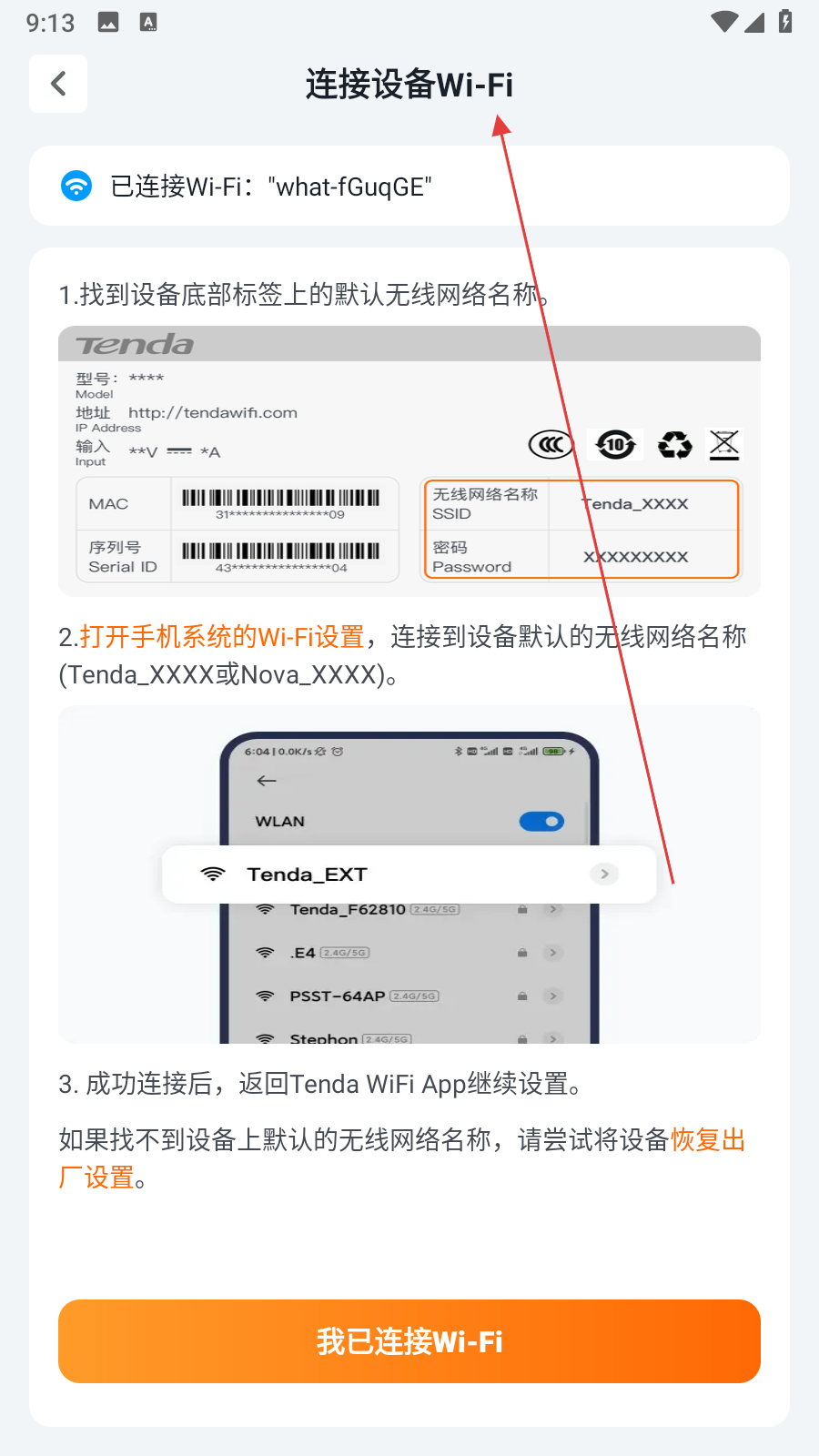 3、查看路由器底部標(biāo)簽的默認(rèn)無線網(wǎng)絡(luò)名稱和密碼,打開手機(jī)WiFi設(shè)置連接該網(wǎng)絡(luò),連接成功后返回應(yīng)用點(diǎn)擊我已連接Wi-Fi按鈕,再按提示完成后續(xù)配置。