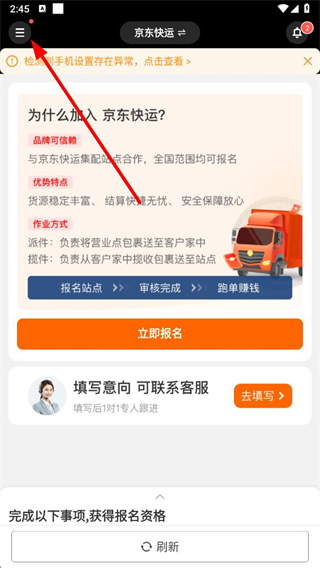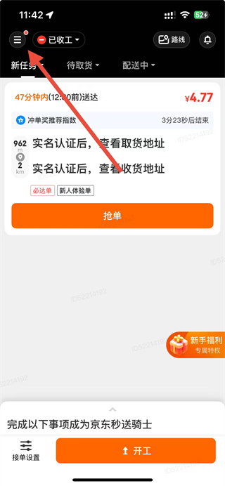 1、打開京東秒送騎士后,點擊左上角的菜單按鈕,展開功能選項。