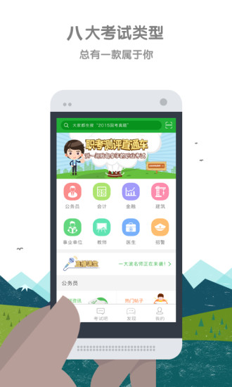 考試通是一款面向成人的職業(yè)考試教育軟件。涵蓋公務(wù)員、事業(yè)單位、教師、會計、財經(jīng)、招警、農(nóng)信社招聘、醫(yī)學(xué)、建筑九大考試類型。滿足一站式(看書、做題、聽課、答疑、交流)備考需求。