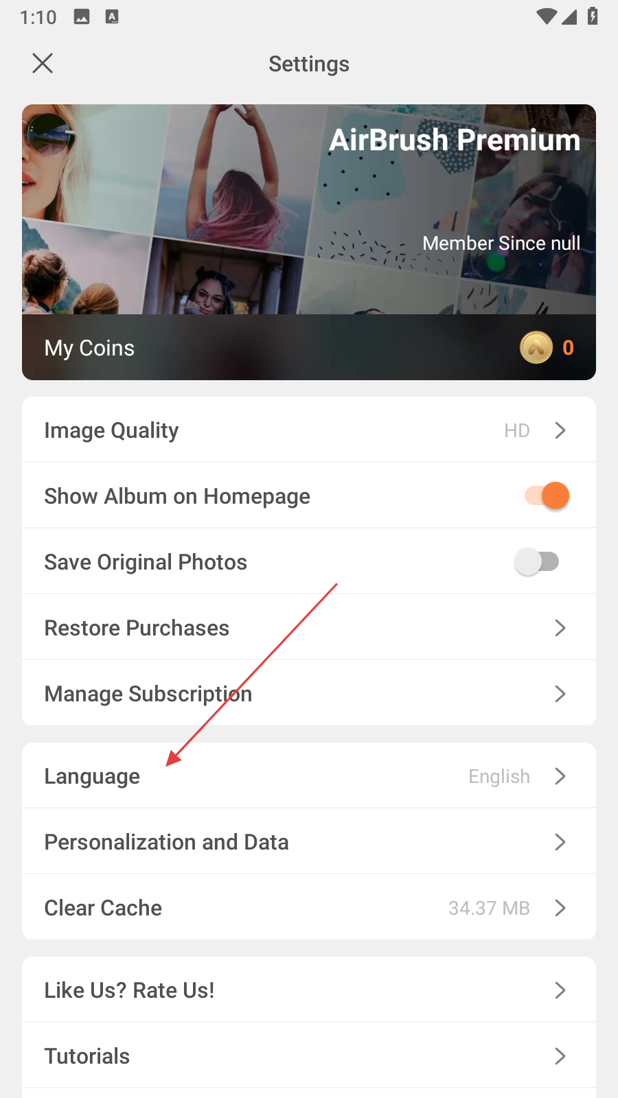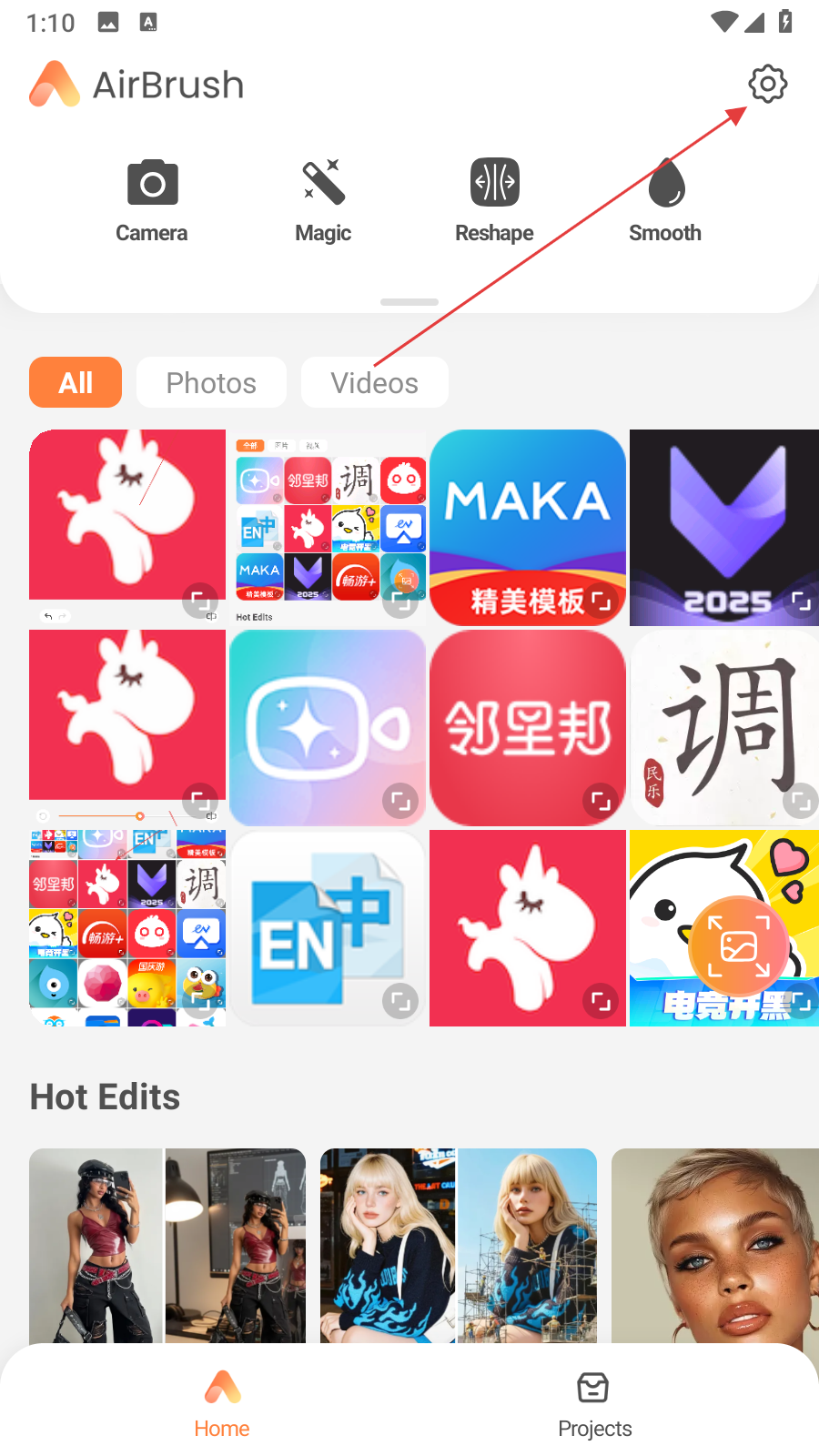 1、打開AirBrush軟件,點擊頁面右上角的設(shè)置圖標(biāo),進(jìn)入設(shè)置界面。
