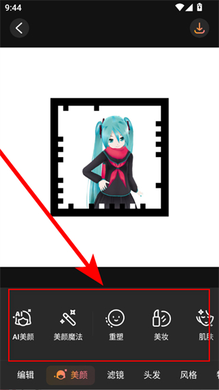 3、圖片選擇后,可在下方使用AI美顏、美顏魔法、重塑、美妝、肌膚等功能對圖片進(jìn)行美顏編輯。