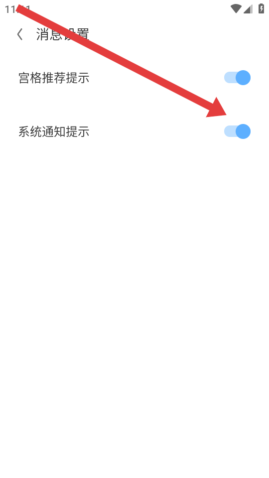 3、在消息設(shè)置的頁面內(nèi),我們需要點(diǎn)擊系統(tǒng)通知提示右側(cè)開關(guān),開啟后會(huì)顯示藍(lán)色。