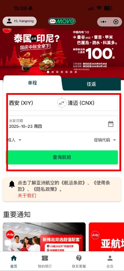 2、輸入出發(fā)地和目的地,并選擇出發(fā)日期、乘客人數(shù)等信息,有促銷代碼也可填入。
