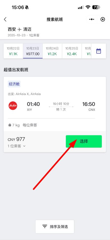 3、點(diǎn)擊查詢航班按鈕,瀏覽搜索結(jié)果,選擇合適的航班,點(diǎn)擊選擇。