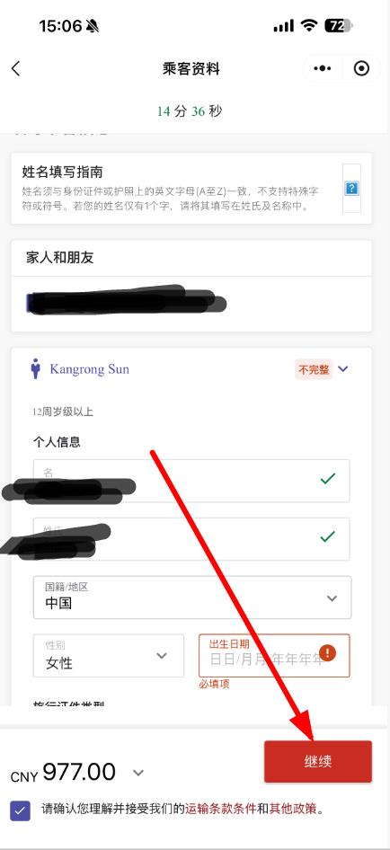 4、在乘客資料頁(yè)面,填寫乘客相關(guān)信息,確認(rèn)無誤后,點(diǎn)擊繼續(xù),并按照后續(xù)提示完成支付等購(gòu)票流程。