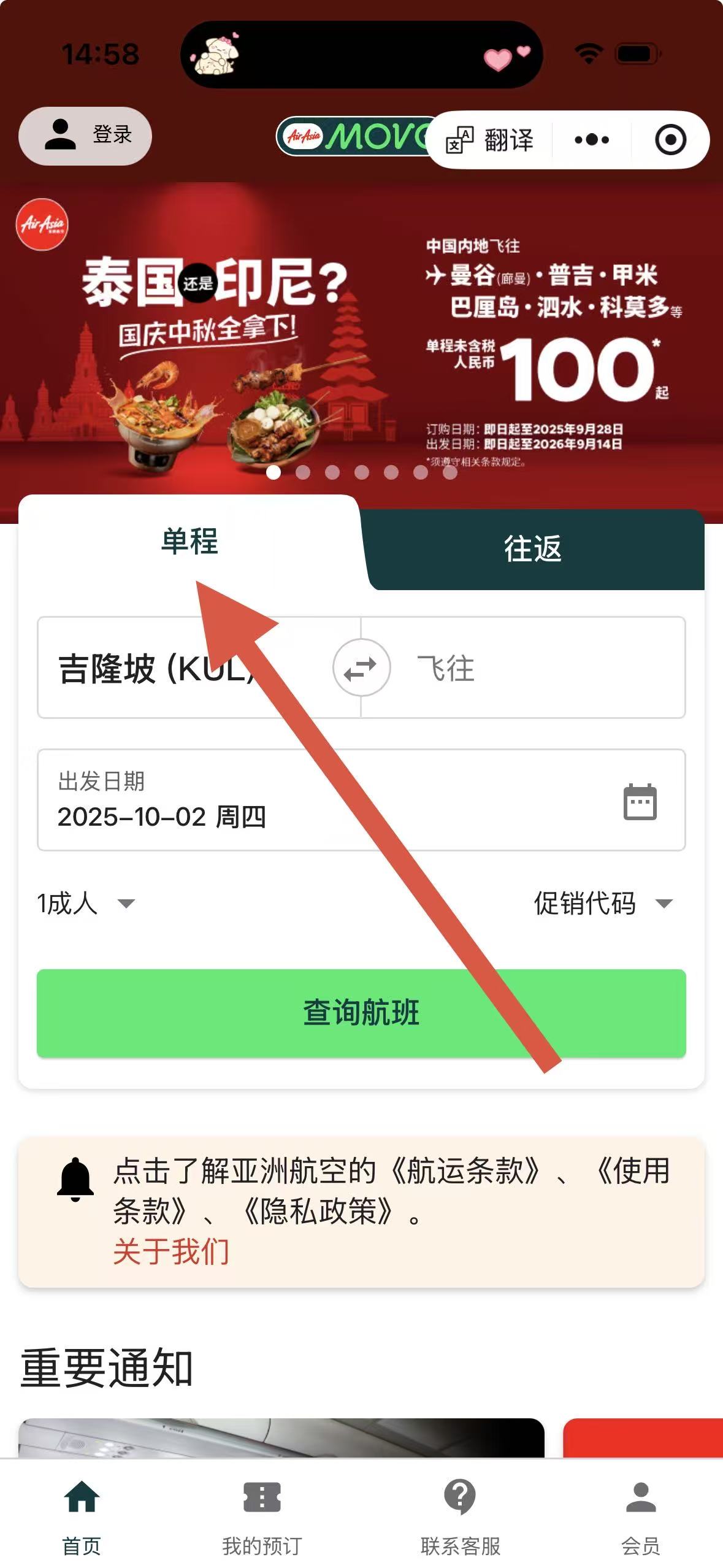 1、打開亞洲航空app,在首頁(yè)確認(rèn)行程類型為單程,若不是則點(diǎn)擊切換為單程。