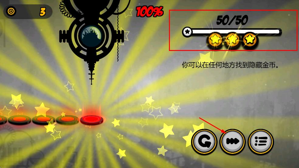 4、成功到達(dá)關(guān)卡終點(diǎn)后,會(huì)顯示通關(guān)進(jìn)度為100%,收集星星數(shù)量達(dá)到50/50,獲得三顆星的評(píng)價(jià),此時(shí)可點(diǎn)擊界面下方的箭頭按鈕,進(jìn)入下一關(guān)繼續(xù)游戲。