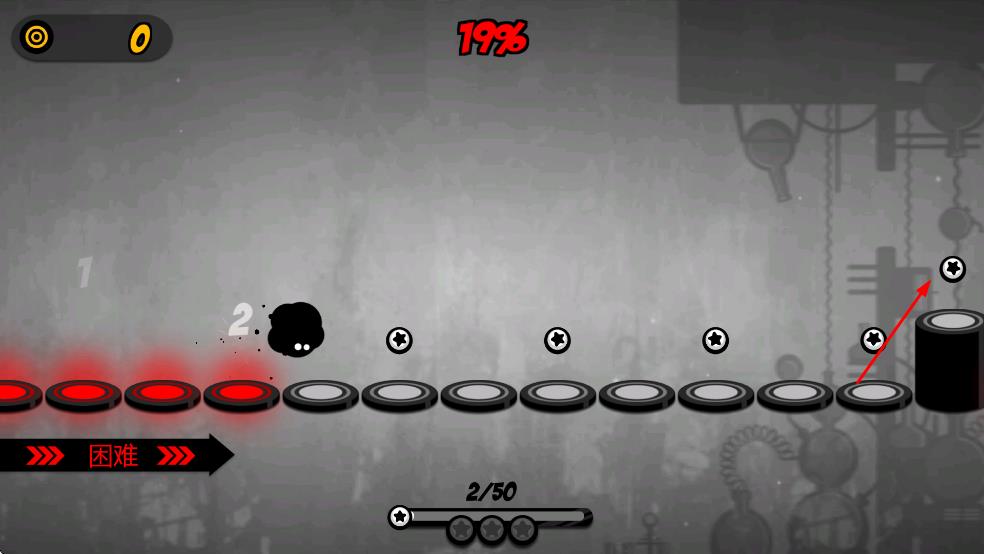 3、在第1關(guān)游戲過程中,操控黑色小生物在圓盤和障礙物間移動(dòng),躲避紅色圓盤等危險(xiǎn)區(qū)域,同時(shí)收集沿途的星星,不斷向關(guān)卡終點(diǎn)前進(jìn)。