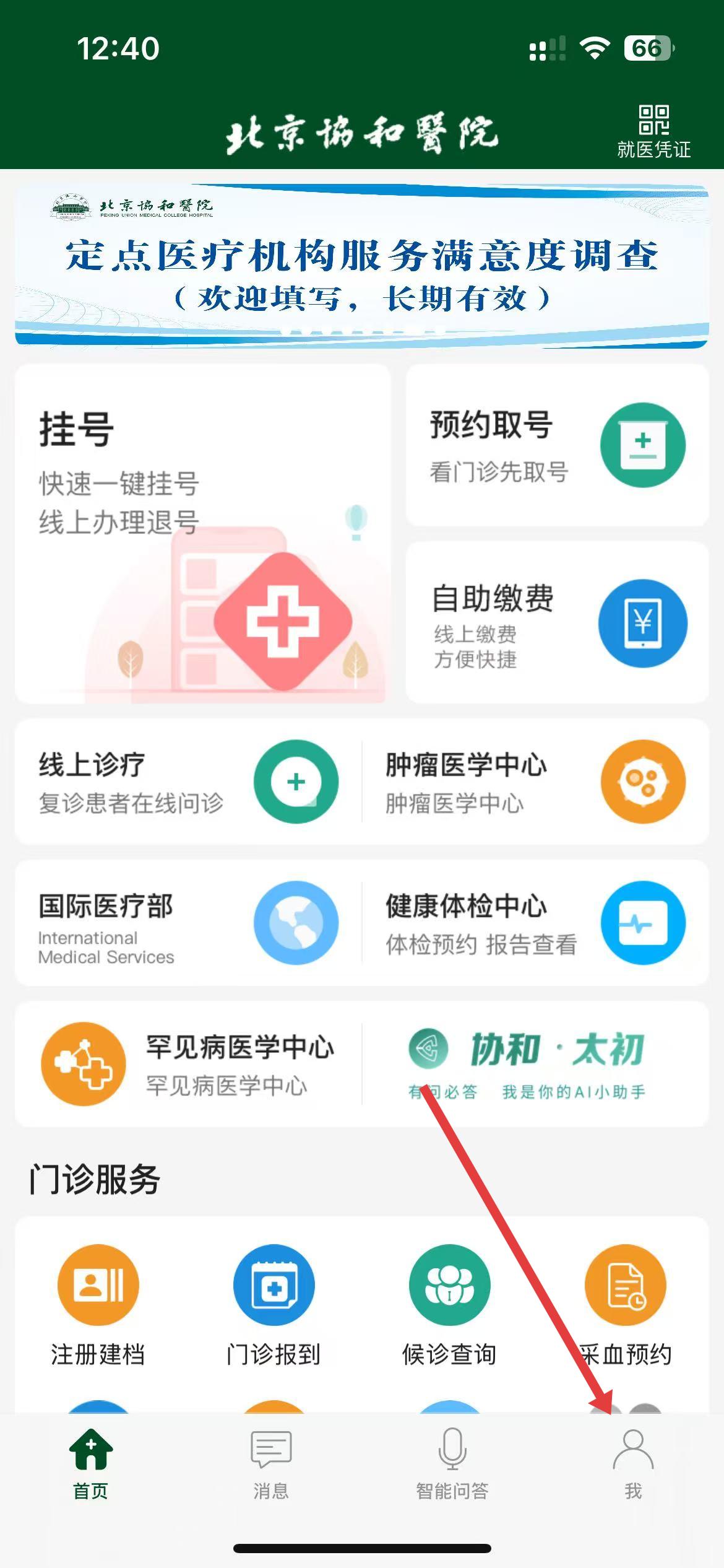 1、打開北京協(xié)和醫(yī)院app,點(diǎn)擊底部導(dǎo)航欄最右側(cè)我選項(xiàng),進(jìn)入個(gè)人中心界面。
