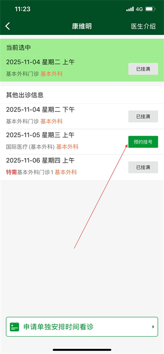 5、在醫(yī)生出診信息頁面選擇可預(yù)約的出診時(shí)間,點(diǎn)擊預(yù)約掛號。
