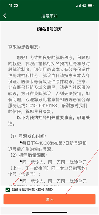 2、在掛號須知頁面,勾選我已閱讀并同意掛號須知,點(diǎn)擊確認(rèn)。